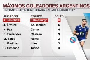 體育資訊10月27日訊 ESPN統計了阿根廷球員在本賽季五大聯賽中的進球數量,并列出五大聯賽阿根廷球員射手榜,斯特拉斯堡大中鋒帕尼切利8球居首。