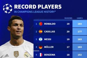 體育資訊09月16日訊 今夜,新賽季歐冠就將打響。德轉在賽前列出了歐冠歷史出場榜,C羅以183場位列榜首,卡西、梅西分列二三。