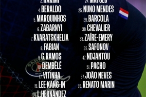 前鋒:7-克瓦拉茨赫利亞、9-貢薩洛-拉莫斯、10-登貝萊、19-李剛?cè)省?9-巴爾科拉、47-恩賈恩圖