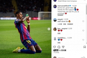 拉什福德社媒曬照慶祝勝利,配文:“主場勝利,氣氛絕佳。感謝大家的支持,蒂埃雷,正如我所承諾,這粒進球獻給你。”