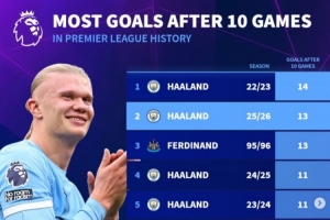 在德轉列出的英超歷史前10輪進球榜中,前五哈蘭德占據四席,22-23賽季前10輪進14球,為歷史最多。