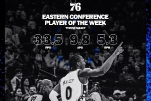 上周馬克西率領76人取得3勝1負的戰績,場均轟下33.5分5.3籃板9.8助攻。