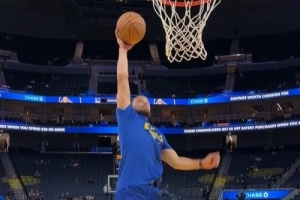 賽前,勇士球星庫里進行熱身,自拋自扣完成單手扣籃。
