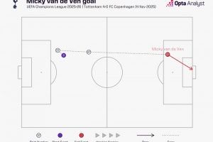 據(jù)Opta統(tǒng)計(jì),范德芬?guī)蚺軇?dòng)67.7米之后破門,這是2015年Opta統(tǒng)計(jì)相關(guān)數(shù)據(jù)以來(lái),歐冠帶球距離最遠(yuǎn)的進(jìn)球。