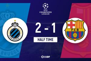 上半場傷停補時2分鐘,半場結束,巴薩暫1-2布魯日。