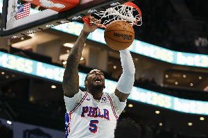 76人內線德拉蒙德上半場替補出戰表現出色,不僅是前場籃板搶得很兇,籃下終結也很高效。