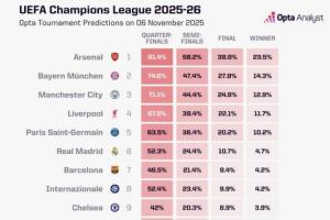 歐冠奪冠概率:阿森納超23%斷檔領跑,拜仁曼城紅軍巴黎皇馬2-6位