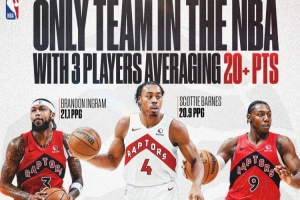 體育資訊11月6日訊 NBA Canada報(bào)道,猛龍隊(duì)是聯(lián)盟目前唯一一支有三位球員場(chǎng)均得分超過20分的球隊(duì)。