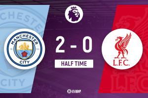 上半場補時7分鐘,曼城2-0利物浦。