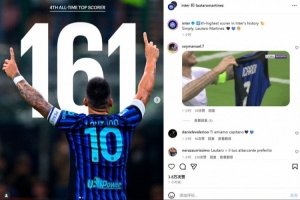 數(shù)據(jù)統(tǒng)計顯示,他也也追平馬佐拉并列國米隊史射手榜第4位。