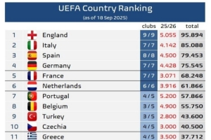 體育資訊9月19日訊 歐冠聯賽階段首輪已經完賽,相關機構也統計了本賽季的歐戰積分情況,并更新了歐足聯旗下各協會的積分排名。英格蘭依然獨自領跑,而意大利第二的位置仍暫時牢固,但領先優勢有略微縮小。