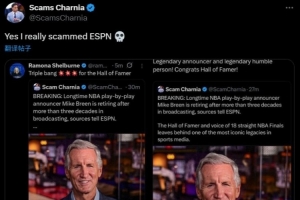 體育資訊9月19日訊 今日,名記Shams的戲仿賬號Scams Charina在推特上進行“日常工作”(即發布假消息),稱ESPN的名人堂解說員邁克-布林將退休。