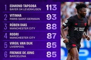 體育資訊9月19日訊 歐冠首輪今日全部戰(zhàn)罷,據(jù)Squawka的數(shù)據(jù)統(tǒng)計(jì),勒沃庫森后衛(wèi)塔普索巴完成113次傳球,傳球準(zhǔn)確率93%,另外他是本輪唯一完成傳球次數(shù)100+的球員。