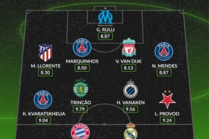 后衛:略倫特(馬競,8.30分)、馬爾基尼奧斯(巴黎,8.50分)、范迪克(利物浦,8.13分)、努諾-門德斯(巴黎,8.87分)