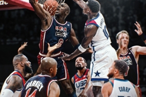 夢(mèng)一隊(duì)陣容:喬丹、魔術(shù)師約翰遜、巴克利、卡爾-馬龍、尤因、皮蓬、大衛(wèi)-羅賓遜、克里斯-穆林、克萊德-德雷克斯勒、斯托克頓、克里斯蒂安-萊特納。