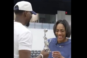值得一提的是,WNBA總裁凱茜-恩格波特手持獎杯,將其交給了阿德巴約。而阿德巴約也開心地給女友頒發了獎杯,阿賈流下了激動的淚水。