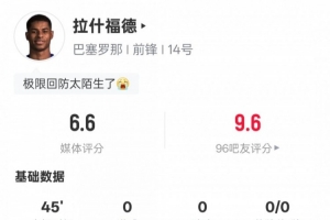 體育資訊9月22日訊 2025-26賽季西甲第5輪,巴薩3-0赫塔費。拉什福德下半場替補出戰(zhàn),2次射正全場最多,傳球成功率93.8%,評分6.6。