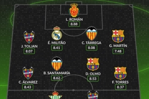 體育資訊9月22日訊 西甲第五輪戰罷,數據網站Whoscored也評選出本輪西甲最佳陣,費蘭等巴薩3人在列,米利唐如選。以下為具體陣容: