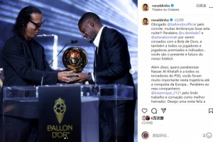 羅納爾迪尼奧社媒曬出頒獎照片,并寫道:“感謝金球獎的邀請,今晚留下了許多美好的回憶!恭喜登貝萊和邦馬蒂榮獲金球獎,也祝賀所有獲獎和入圍的球員們……你們是足球的現在和未來。”
