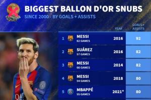 體育資訊09月24日訊 德國轉會市場盤點了各年份金球獎數據,排出了對應年份中無緣金球獎的最高進球+助攻數據。以下是詳細排名。