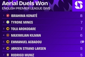 體育資訊9月24日訊 英超第5輪戰罷,squawkafootball列各項數據排行,利物浦中衛科納特是本輪贏得爭頂最多的球員,共計8次。