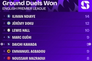 體育資訊9月24日訊 英超第5輪戰罷,squawkafootball列各項數據排行,埃弗頓邊鋒恩迪亞耶是贏得地面對抗最多的球員,共計14次。