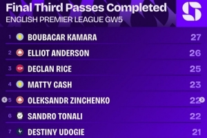 體育資訊9月24日訊 英超第5輪戰罷,squawkafootball列各項數據排行,維拉中場布巴卡爾-卡馬拉是在進攻三區完成傳球最多的球員,共27次。