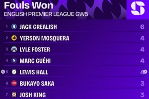 體育資訊9月24日訊 英超第5輪戰罷,squawkafootball列各項數據排行,格拉利什是本輪造對手犯規次數最多的球員,共有6次。