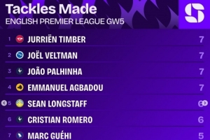 體育資訊9月24日訊 英超第5輪戰罷,squawkafootball列各項數據排行,廷伯、帕利尼亞等四名球員是本輪完成搶斷次數最多的球員,各有7次。