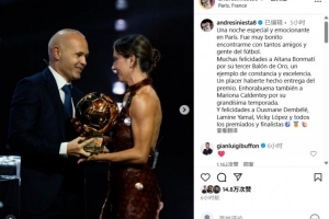 體育資訊9月25日訊 巴薩傳奇伊涅斯塔出席金球典禮為女足金球獎頒獎,今日他更新社媒為所有獲獎者和提名者送上祝賀。